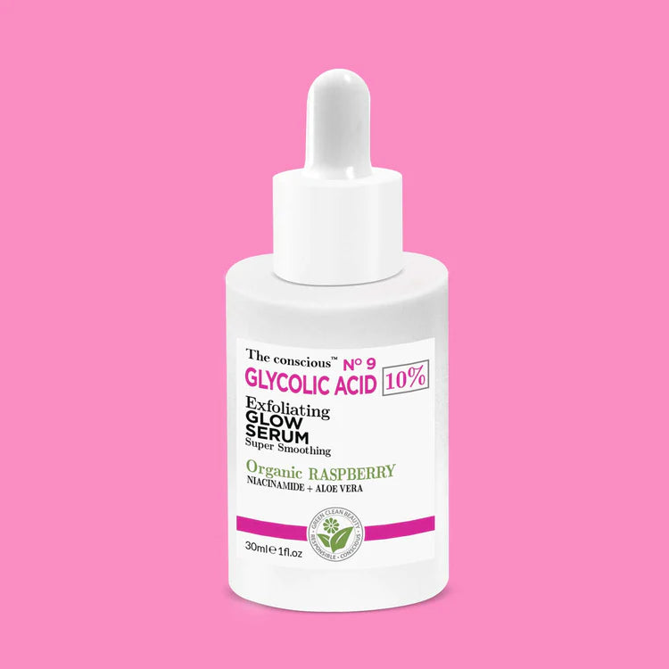 The conscious™ skin-transforming Exfoliating Glow Serum with Glycolic Acid, Niacinamide & Organic Raspberry Leaves removes build-up of dead skin cells and target pores to help reduce the appearance of signs of aging for smooth, renewed and glowing skin.
