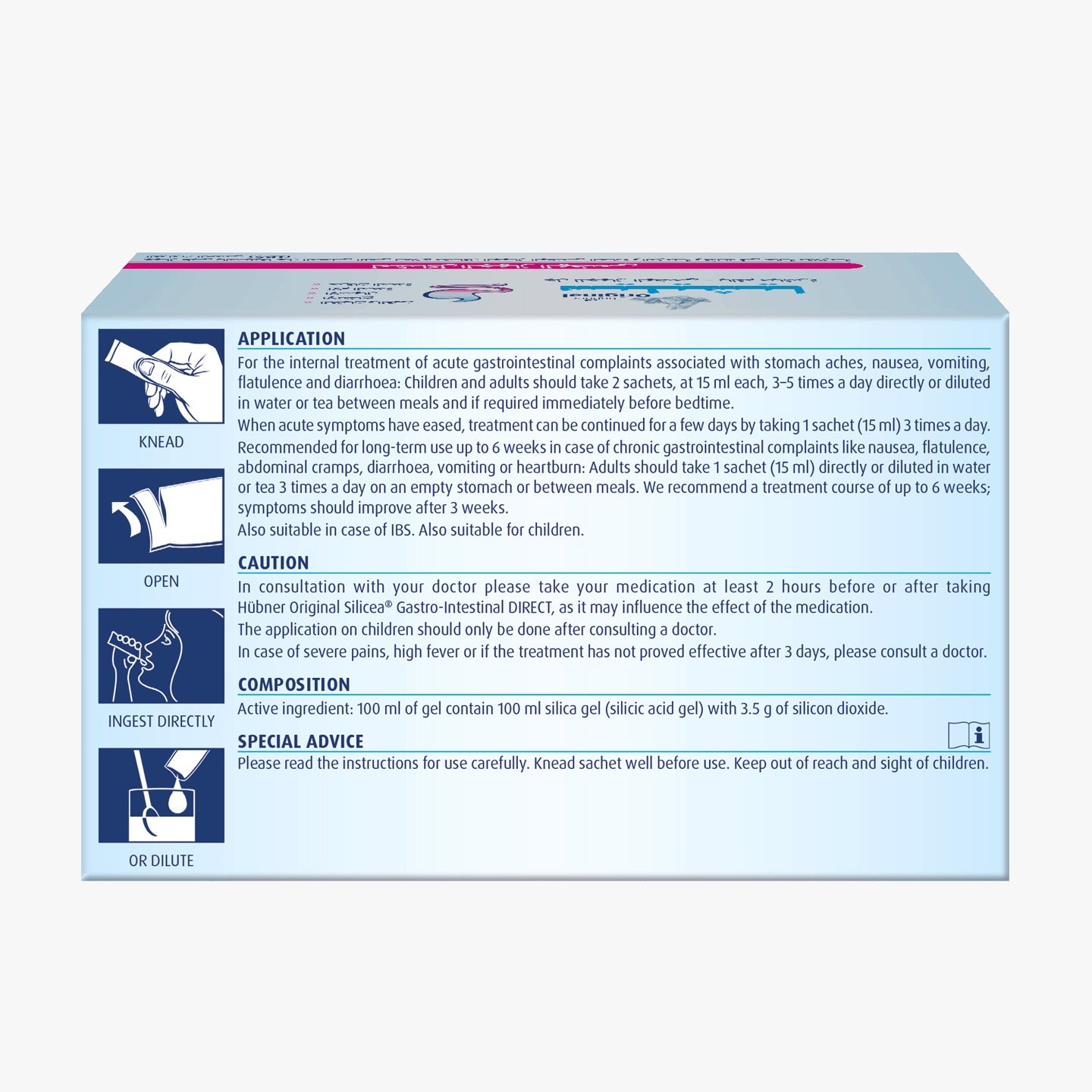 Hübner Original Silicea® Gastro-Intestinal DIRECT is a purely mineral and well-tolerated medical device without additives. Also suitable for children.