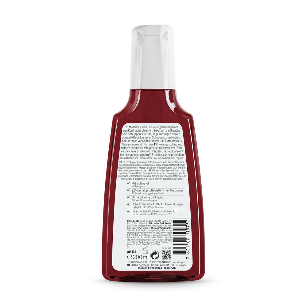 The RAUSCH range includes 13 shampoos and 1 exfoliating shampoo to meet all kinds of different needs, all developed and produced in Kreuzlingen near Lake Constance and made with a minimum of 89% ingredients of natural origin. This means we have the right product for your individual hair type and for every specific need – from shampoo to combat dandruff and hair loss to shampoo for dry or damaged hair.